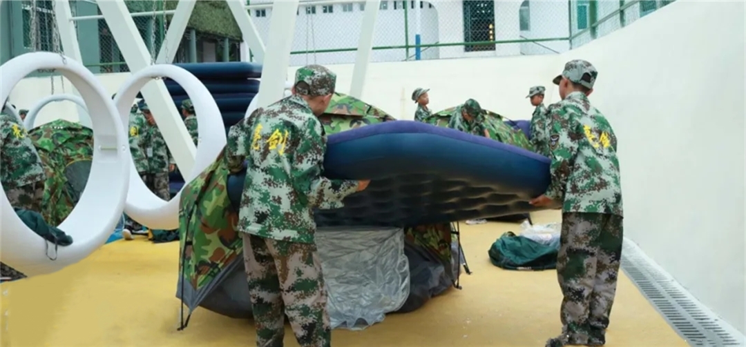 | 下午 | 军事训练:军姿军体形象训练,单个军人队列训练。(站如松,坐如钟,行如风,培养雷厉风行的优良作风) 内务训练与整理:学习物品的整理和摆放,训练生活自理能力,把被子叠成豆腐块,标准决定水准,原来被子可以叠得如此漂亮。 |